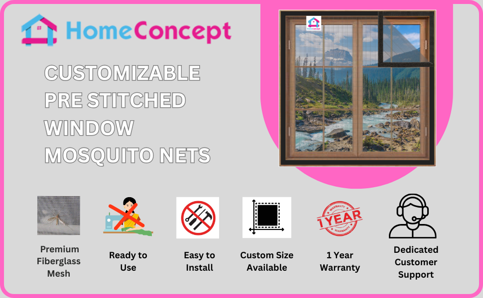 Home Concept fiberglass pre stitched mosquito mesh for windows. The black mosquito net is stitched with loop tape and comes with self-adhesive hook tape for easy installation.