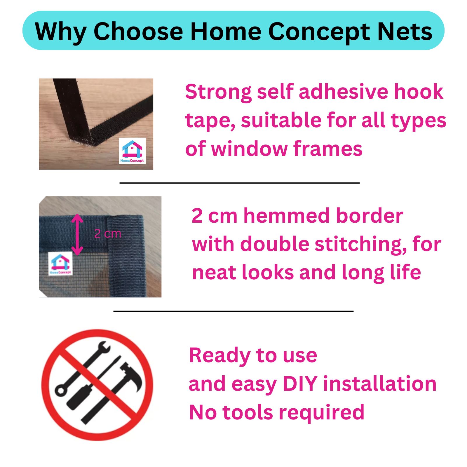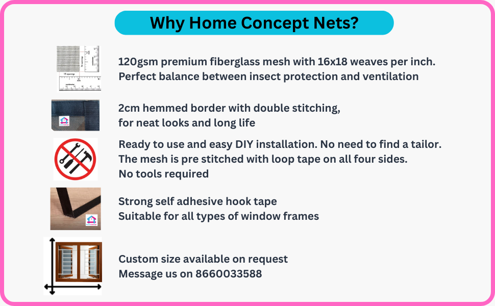 - Home Concept pre-stitched fiberglass mesh for windows with self-adhesive hook tape.